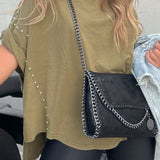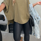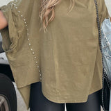 Yüksek Rulolu Kollar ve Perçinlerle Oversize T-Shirt