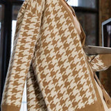 Yumuşak polyesterden üretilmiş büyük beden houndstooth desenli triko ceket ile rahat stilinizi yükseltin. Klasik houndstooth deseni ve geniş omuz kolları ile bu hırka, her mevsim katmanlı görünüm için mükemmel olan rahat bir kesim sunar.