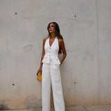 Set, şık bir üst ve uyumlu bir pantolondan oluşmaktadır ve birlikte uyumlu bir bütünlük oluşturur. İster ofiste ister rahat bir gezide, bu kıyafet seti, her moda bilincine sahip kadın için kesinlikle sahip olunması gereken bir parça.