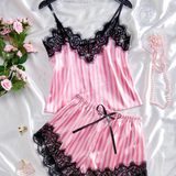 Çizgili saten set, lüks ve konforu bir arada sunuyor. Bu şık pijama seti, kontrast dantel süslemeli Cami üstü ve saten şortlardaki kurdele detayıyla dikkat çeken çizgili saten kumaşıyla öne çıkıyor. Şıklık ve zarafeti bir araya getiren gece kıyafetleri koleksiyonunuz için mükemmel bir tamamlayıcıdır.